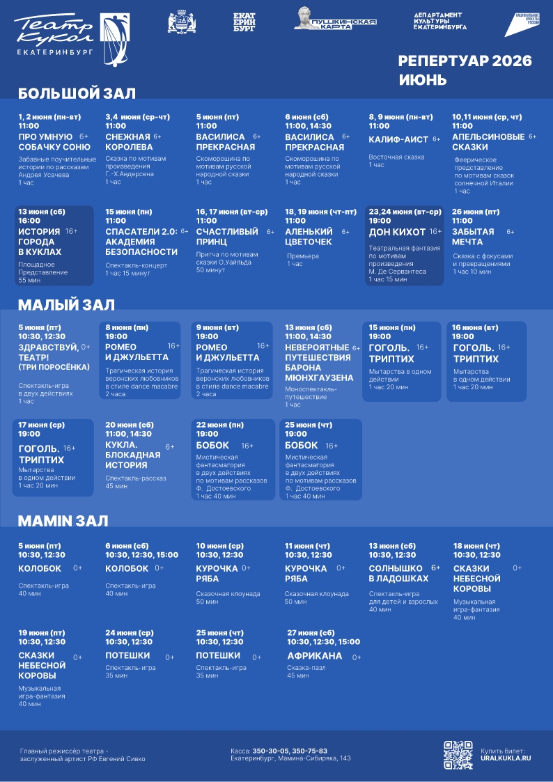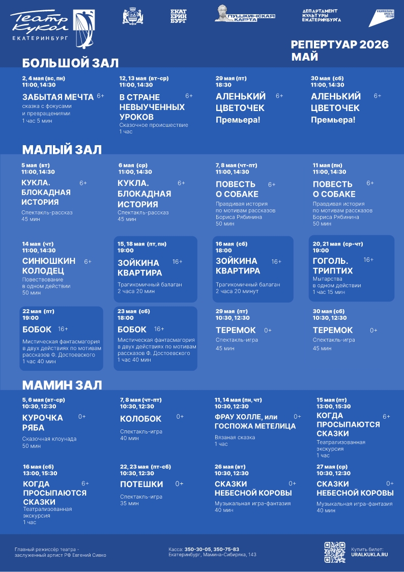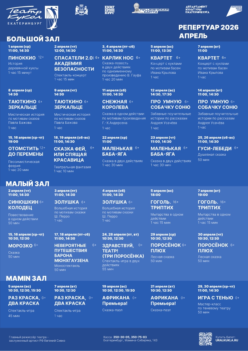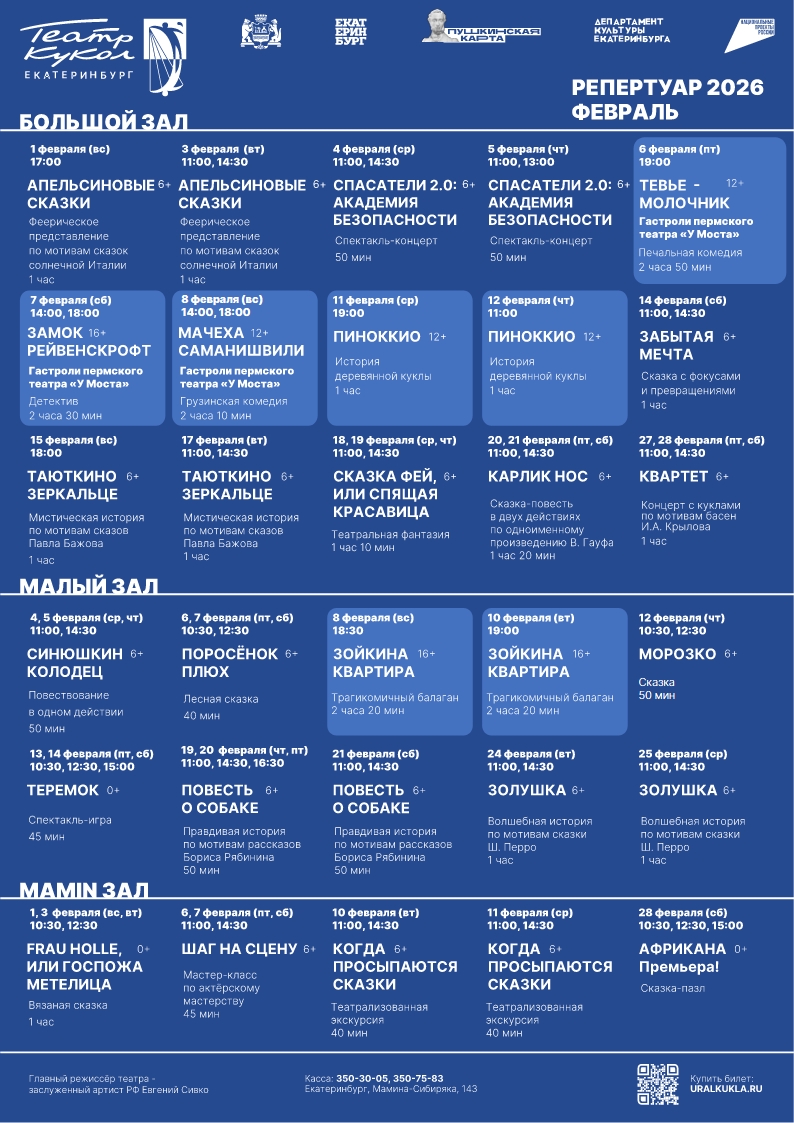 Уважаемые зрители! На этой странице вы всегда можете скачать афишу Екатеринбургского театра кукол на интересующий вас месяц